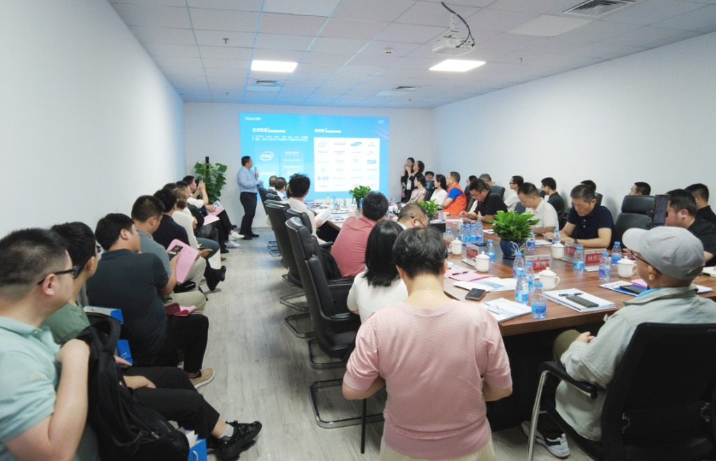 南山区工商联党组书记乐丽华、人工智能产业链党委书记&深圳市人工智能产业协会执行会长范丛明带领人工智能产业协会的40多位企业家莅临Gooxi参加了此次活动,Gooxi董事长赵士亮、副总裁张思栋、产品营销总监王飞宇等领导热情接待了来访领导及企业家。